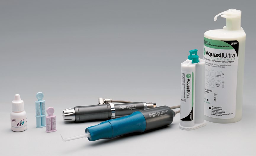 Precizan otisak, bez uporabe retrakcijskog konca, u jednostavnom, brzom i djelotvornom postupku, sustav je koju je razvila tvrtka DENTSPLY International Inc. Aqusil Ultra Cordless sustav sastoji se od nekoliko elemenata koji se skladno nadopunjuju. Ključno mjesto zauzima Digit Power Dispenser, odnosno ručni nastavak s adapterom koji se montira na zračno-turbinski nastavak. Uz mogućnost regulacije četiri brzine aplikacije i ergonomski balansiranu dršku, aplikacija otisne mase može se precizno kontrolirati. Optimalna adherencija otisne mase pospješuje se prethodnim tretmanom otisnog područja primjenom otopine B4 Pre-impression surface optimizer, koja izjednačava površinsku napetost i omogućava dobro prianjanje otisne paste. Pasta Tissue Managing Wash Material, koja se aplicira intraoralno pomoću Digit Power dispenzera dolazi u Single i Multi-Unit pakiranjima, čiji se dvokomponentni sadržaj miješa u dispenzeru te izlazi pod odgovarajućim pritiskom. Odlikuje se vrlo visokom otpornošću na istezanje, odnosno deformaciju, a operativno vrijeme je vrlo kratko (35 sekundi), što osigurava preciznost bez artefakta. Aplicira se uz pomoć specifičnog nastavka – Intrasulcular tip, koji dodatno osigurava korektno prikazivanje rizičnih područja.Druga faza otisnog postupka uključuje primjenu Tissue Managing Tray Material – kompaktne paste (heavy body) u otisnoj žlici. Vrijeme manipulacije ovisi o opsežnosti otisnog područja, od 3 do 4,5 minute, a pakiranja su veličine 50 i 380 ml. |