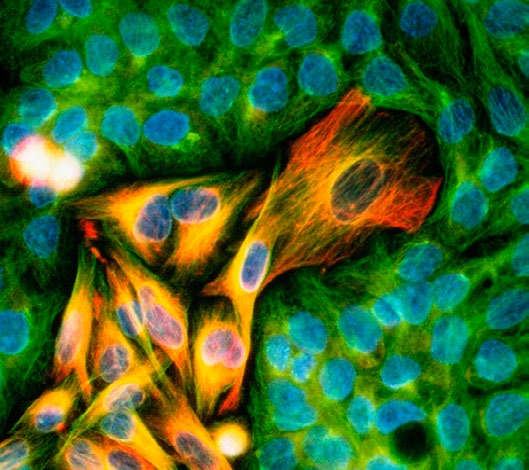 GULIVER IMAGE / SCIENCE PHOTO LIBRARY Melanom je izrazito zloćudan tumor koji se razvija iz melanocita, stanica kože u kojima se stvara pigment melanin. Sastoji se od velikih, nediferenciranih stanica. Slika prikazuje invadiranje stanica melanoma (obojene narančasto) u epitel kože (zdrave stanice obojane su zeleno; jezgre stanica obojane su plavo) - imunofluorescencija, svjetlosni mikroskop, povećanje 400 x |