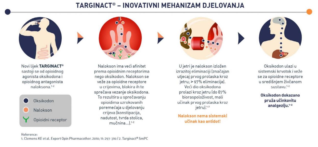 Kronična bol postaje sve veći problem i u Hrvatskoj i u svijetu. Podaci pokazuju da oko 500 milijuna ljudi u svijetu pati od kronične boli, a svaki peti odrasli Europljanin ima umjerenu do jaku kroničnu bol. Bol u značajnoj mjeri narušava kvalitetu života i funkcioniranje u svakodnevnom životu: od uobičajenih aktivnosti i spavanja do obavljanja redovitog posla te dovodi do razvoja kroničnoga bolnog sindroma. Opiodi se koriste u liječenju umjerene do jake boli, u što pripadaju jaka nemaligna bol, uključujući i bol u leđima i osteoartritis, kao i jaka maligna bol. Svi opiodi, slabi i jaki, vežu se za opioidne receptore smještene u mozgu, leđnoj moždini i gastrointestinalnom traktu. Koriste se s ciljem smanjivanja doživljaja boli do potpunog blokiranja bolne senzacije i na taj način omogućuju bolju kvalitetu života. Na žalost, njihovo vezanje za receptore u gastrointestinalnom traktu uzrokuje poremećaje crijevne funkcije koji otežavaju učinkovito liječenje kronične boli. Pri primjeni opioida javljaju se opioidima uzrokovani poremećaji crijevne funkcije (poremećaji u djelovanju gastrointestinalnog trakta) od kojih je najdominantniji i najtvrdokorniji poremećaj, odnosno nuspojava, konstipacija, a dodatno se razvijaju mučnina, povraćanje, nadimanje, tvrda stolica, nepotpuno pražnjenje crijeva, abdominalni grčevi i bolovi. U 40 do 90% bolesnika javlja se opioidima uzrokovana konstipacija, koju je vrlo teško liječiti. Opioidima uzrokovani poremećaji crijevne funkcije mogu u značajnoj mjeri utjecati na kvalitetu života i obavljanje dnevnih aktivnosti, a i na liječenje boli – zbog nuspojava – bolesnici odustanu od lijeka ili smanjuju dozu, koja im onda u odgovarajućoj mjeri ne olakšava bol. U određenom broju slučajeva tim se nuspojavama ne pridaje dovoljno pozornosti, a u određenog broja bolesnika je nuspojave, osobito konstipaciju, vrlo teško liječiti.Dosad bez učinkovitog rješenjaKoji je patofiziološki mehanizam poremećaja crijevne funkcije uslijed primjene opioida? Vezanje opioida za mu (μ) opioidne receptore u crijevima ima za posljedicu smanjenje tonusa i kontraktilnosti crijeva, dulju pasažu i povećanje tonusa sfinktera.S obzirom na učestalost najtvrdokornijeg između poremećaja – konstipacije – pri primjeni opioida bolesnicima se odmah preporučuju nefarmakološke metode, što podrazumijeva konzumiranje hrane bogate vlaknima, povećani unos tekućine i povećana fizička aktivnost. S obzirom da je riječ o bolesnicima koji pate od umjerene do jake kronične boli, fizička aktivnost najčešće je u velikoj mjeri ograničena. Ako se preporučenim mjerama ne postiže učinak, preporučuje se uvođenje laksativa u terapiju. Većina djeluje tako što se poveća volumen stolice u crijevu i potiče peristaltički val.Opioidima uzrokovana konstipacija vrlo je često prisutna u bolesnika unatoč agresivnoj terapiji laksativima. Liječenje konstipacije iznimno je složeno i ponekad vrlo teško s obzirom da određeni broj bolesnika ne reagira na preporučene terapijske postupke. Liječenje zahtijeva dobru suradnju bolesnika i liječnika. Klinička istraživanja pokazuju da nakon primjene laksativa manje od 50% bolesnika dostigne samo neko djelomično olakšanje jer laksativi djeluju samo na kolon, a zbog djelovanja opioida narušen je cijeli gastrointestinalni sustav. Laksativi nisu predviđeni za liječenje opioidima uzrokovanih poremećaja u djelovanju crijeva kao što je konstipacija i uzrokuju dodatne značajne nuspojave (mučninu, napuhnutost, elektrolitski disbalans, lijeno crijevo...). Targinact – olakšava bol i sprječava poremećaje crijevne funkcijeTarginact tablete novi su analgetik na hrvatskom tržištu, u svijetu poznat i u primjeni već 10 godina. Tableta se sastoji se od dva aktivna sastojka lijeka, oksikodona i naloksona, oba u obliku s produljenim oslobađanjem. Oksikodon pripada u jake analgetike, veže se za mu opioidne receptore u mozgu i leđnoj moždini te se koristi u kontroli jake boli. Nalokson se veže za mu opioidne receptore u crijevima i sprječava vezanje oksikodona, a posljedica je sprečavanje opioidima uzrokovane konstipacije i ostalih spomenutih nuspojava u gastrointestinalnom traktu kao što su mučnina, nadutost, tvrda stolica… Budući da se nalokson vrlo brzo metabolizira u jetri, nakon prvog prolaska kroz jetru u sistemskoj cirkulaciji ostaje manje od 3%, što nije dovoljno da nalokson antagonizira analgetski učinak oksikodona. S druge strane, oksikodon ima visoku bioraspoloživost – do 87% – i nudi učinkovit i dugotrajan 12-satni analgetički učinak. Istraživanja su pokazala da se nakon uvođenja Targinacta u terapiju vrlo brzo, već unutar tjedan dana, uspostavlja funkcija crijeva i regulira stolica uz učinkovito olakšanje boli. Iskustvo iz prakse je pokazalo da se stolica regulira i unutar par dana uz pokrivenu bol i učinkovitim 12-satnim analgetskim učinkom. Više od 70% pacijenata je referiralo da se nakon uvođenja Targinacta u liječenje, kao zamjena za ostale opioide, regulirala crijevna funkcija te su se u značajnoj mjeri smanjile ili potpuno regredirale gastrointestinalne nuspojave. Targinact je jedini opioidni analgetik koji zbog inovativne kombinacije dviju djelatnih tvari u oralnom obliku učinkovito olakšava bol, ali i istodobno sprječava i opioidima uzrokovane poremećaje u djelovanju crijeva i čuva normalnu crijevnu funkciju u bolesnika. |
