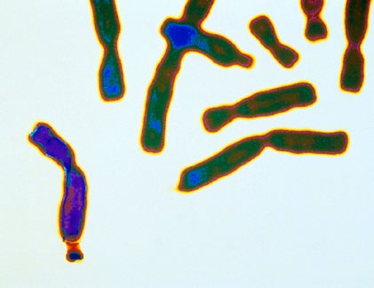 Mikroskopski snimak kromosoma X (prikazan ljubičastom bojom) osobe sa sindromom Fragilni X. Bolest je dobila naziv prema krhkom mjestu na dugom kraku kromosoma X (q27.3) koje se očituje u posebnim uvjetima kultiviranja kromosoma u mediju siromašnom folnom kiselinom. Sindrom je uzrokovan greškom gena koji kodira protein nužan za razvoj mozga. Simptomi bolesti uključuju mentalnu retardaciju, hiperaktivnost, izduljeno lice, duge naglašene uške, spljošten nos, te slabu motoričku pokretljivost |