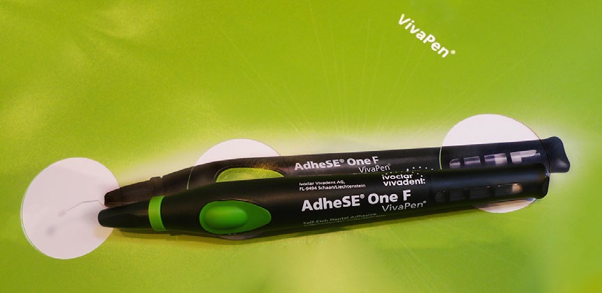 AdheSE One F je nova, poboljšana, sedma generacija samojetkajućih adheziva tvrtke Ivoclar Vivadent. Prema navodu proizvođača, dovoljan je samo jedan sloj AdheSE One F, bez prethodnog jetkanja, za ostvarivanje trajne i stabilne veze između zuba i površine ispuna. Uz pH vrijednost od 1,4, AdheSE One F sadrži fluor, koji se postupno oslobađa, smanjuje postoperativnu osjetljivost i značajno povećava čvrstoću snage veze s caklinom do izmjerenih 32 MPa, te s dentinom od 36 MPa u prva 24 sata. Na dentin se veže infiltrirajući dentinske tubule, umrežava se s rastopljenim zaostatnim slojem i stvara novi, hibridni sloj od kolagena i svjetlom polimeriziranog adheziva. Zahvaljujući hidrolitički stabilnim monomerima, AdheSE One F nije potrebno držati u hladnjaku, može se skladištiti na sobnoj temperaturi. Pakiran je u inovativnom obliku zaštićenog imena VivaPen, koji podsjeća na kombinaciju pisaljke i ručnoga dentalnog instrumenta. Nije potrebno nanositi adheziv iz bočice na aplikator-četkicu, jer je on sve to u jednom, štedeći pritom materijal i vrijeme. Vrh aplikatora (kanula) ima odgovarajući kut koji olakšava nanošenje i na teže dostupna mjesta, a mijenja se jednostavnim „snap-onof“ sistemom (pritiskom ili povlačenjem). Ostavlja minimalnu mogućnost zaostatka, kapanja ili gubitka materijala tijekom cijelog postupka nanošenja. Mehanički pritisak na zeleno dugme potiskuje adheziv prema aplikatoru te je kontrola vlaženja četkice maksimalna. Indikator potrošenog materijala nalazi se na vrhu VivaPena, on je prozirna skala koja omogućava jednostavno uočavanje razine preostalog adheziva. Proizvođač navodi kako se u jednom pakiranju VivaPen s AdheSe One F-om nalazi dovoljno adheziva za minimalno 120 aplikacija, što sugerira visoku iskoristivost u dentalnoj praksi, a time i ekonomičnost. |